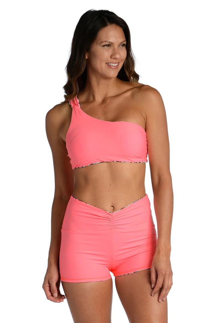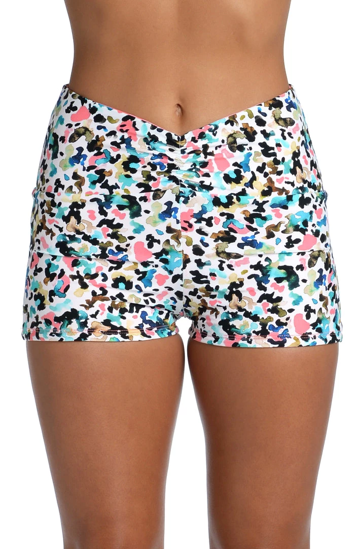 The colorful confetti on these shorty shorts brings a mod update to the classic camouflage print. Offering two looks for twice the wear, they reverse from a multi camo pattern to deep solid pink. The shirred waist slims and tones the tummy while the booty cut keeps things sexy without getting too cheeky.