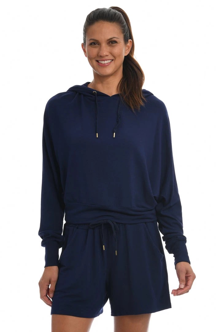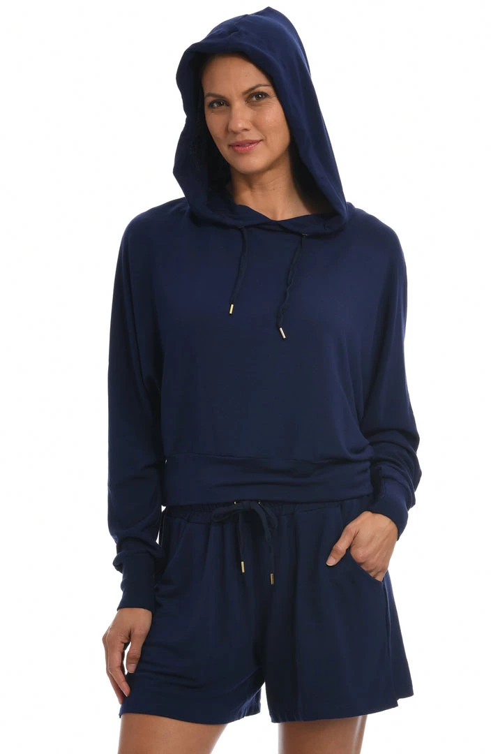 We’re loving the laid-back yet pulled together vibe of this cozy French-terry knit collection. The super cute and comfy drawstring hoodie is styled with Dolman sleeves and a cropped cut.