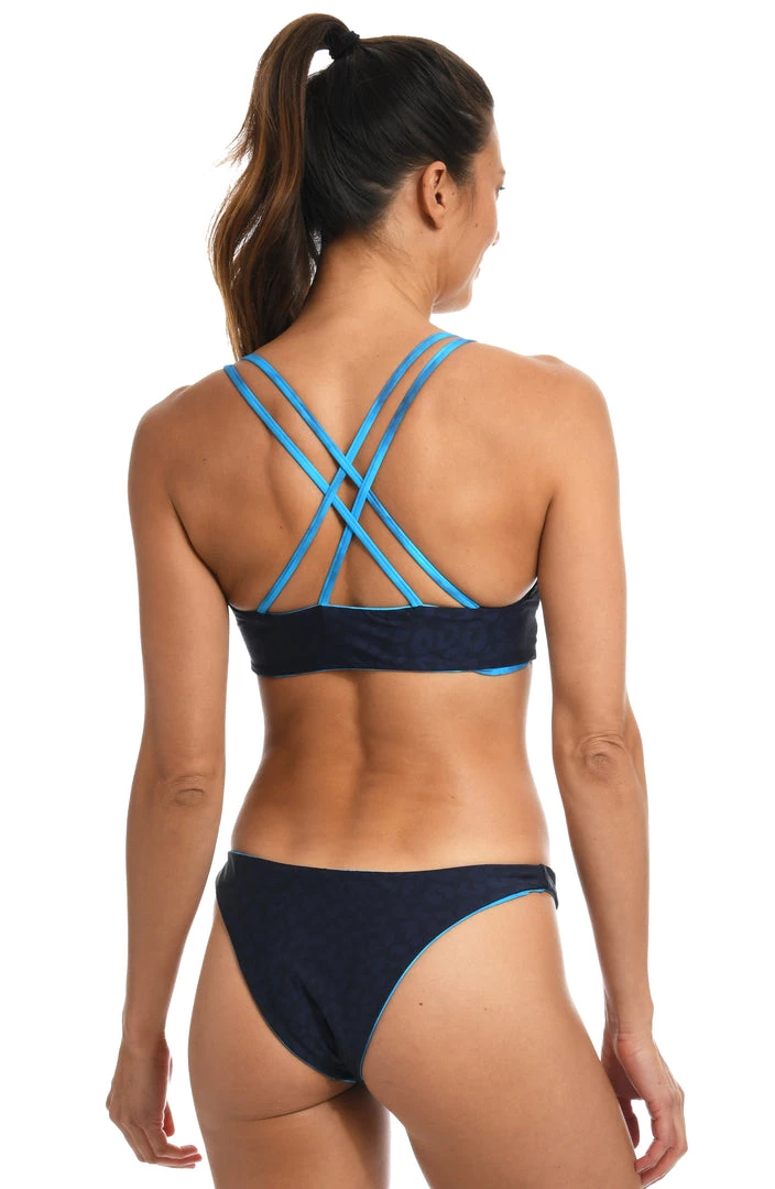 Nothing but blue skies ahead in this Insta-worthy bralette in a dreamy cloud-inspired design. Offering two looks for twice the wear, it reverses to a cheetah print in midnight blue. The double-strap design crisscrosses in back for ultimate impact.