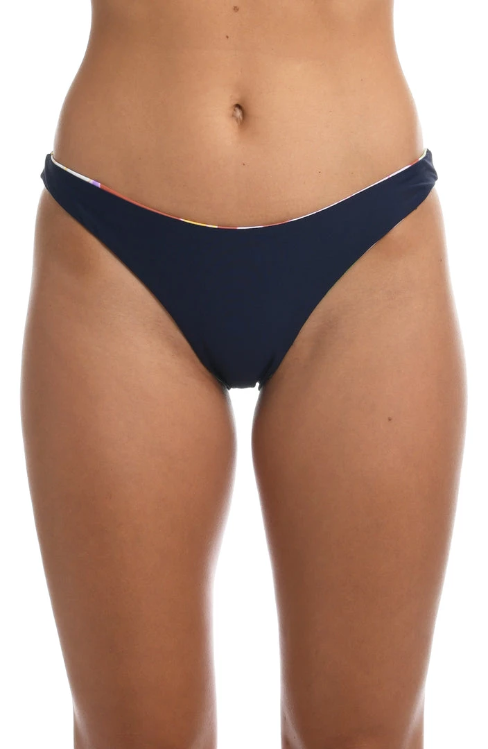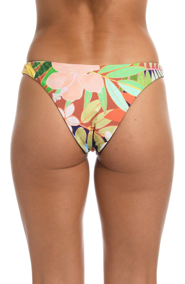 Hello, sunshine! These cheeky hipster bottoms pack a lot of punch โ without taking up too much room in your suitcase โ thanks to a reversible design. Solid blue on one side, a tropical print on the other โ it’s just another day in paradise.