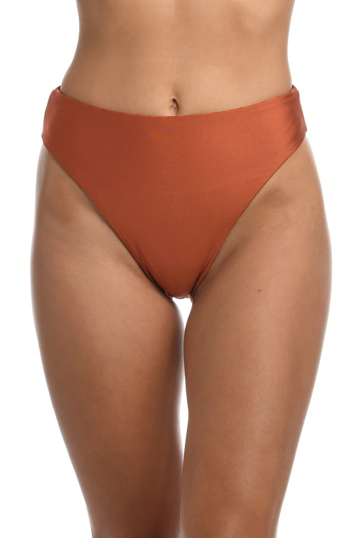These high-waist swim bottoms hit the spot with an allover dotted cheetah pattern in yummy, salt-of-the-earth-hues. Offering two looks for twice the wear, they reverse to a solid shiny clay color. The high waist slims the tummy, while high-cut legs allow you to show off your assets.