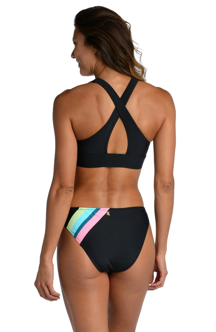 This bra top gets its groovy vibe from bold bands of color that pop against a solid black ground. Styled with a high neck and crisscrossing straps for firm support, it’s the perfect choice to wear from the barre to the beach.