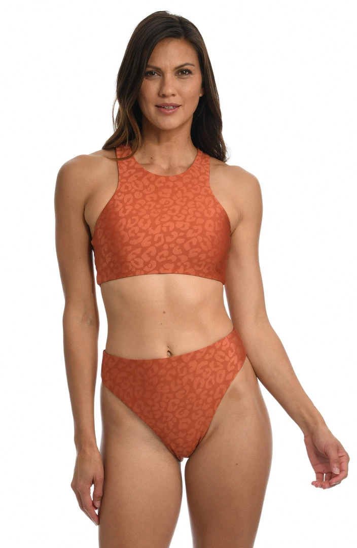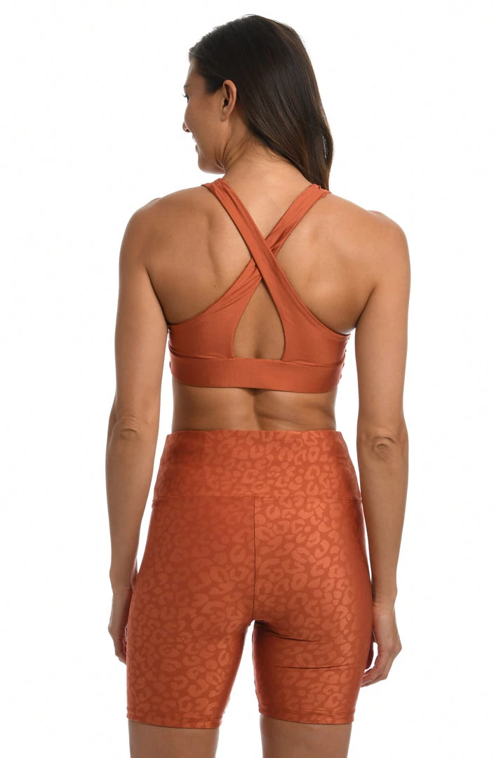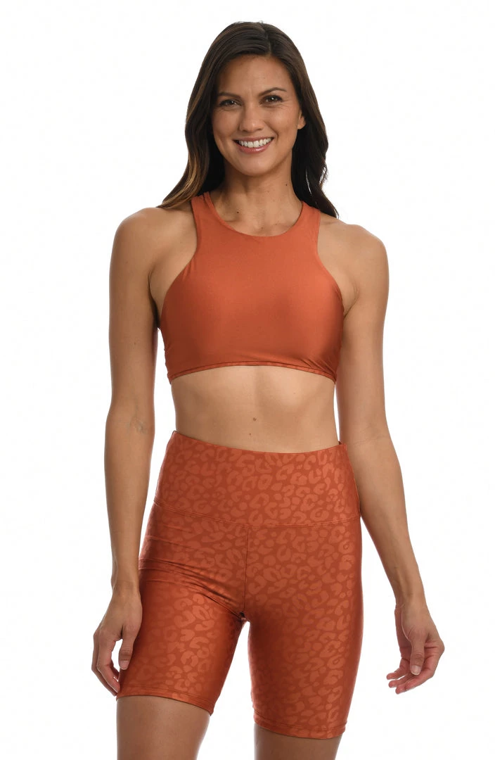 This bra top hits the spot with an allover dotted cheetah pattern in yummy, salt-of-the-earth hues. Offering two looks for twice the wear, it reverses to a solid shiny clay color. A high neck and crisscrossing straps for firm support make it the perfect choice to wear from the barre to the beach.