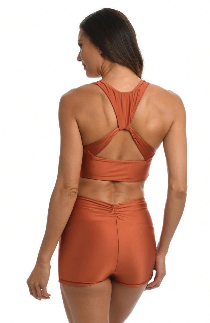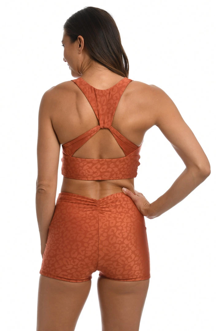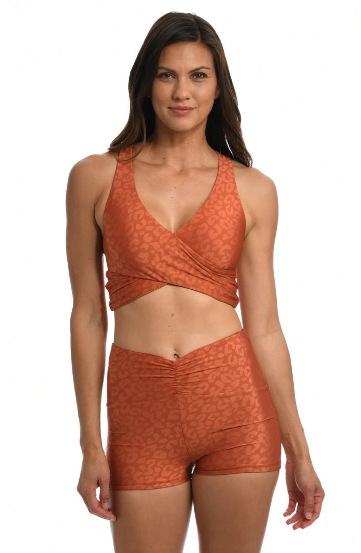 This bra top hits the spot with an allover dotted cheetah pattern in yummy, salt-of-the-earth hues. Offering two looks for twice the wear, it reverses to a solid shiny clay color. A deep V-neck, wrapped front and cropped length cut a sexy silhouette.