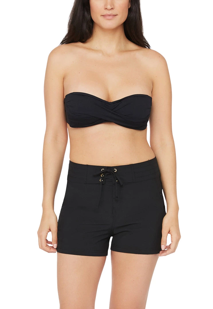 Be sporty in style in these versatile swim board shorts by La Blanca. Front seamed pockets add to the convenience and storage of your portable items. A drawstring adjusts to your comfort and fit, for both in and out of the water. The 3″ length offers coverage, while still flaunting your legs.