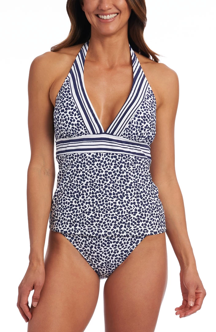 Take the plunge and give yourself a sexy silhouette with this halter tankini top featuring a low v-neckline. The abstract dot pattern is offset by striped bands inside and under the bustline to accentuate your figure. Built-in tummy control gives you the confidence you need to show off your sleek, toned look.