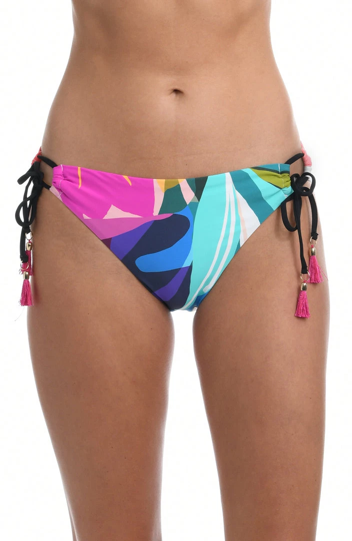 Bursting with color, these vibrant tropical print swim bottoms will put you in a vacation state of mind. Leaving a little something to the imagination, adjustable side tie loops trimmed with playful tassels reveal just a hint of skin. The hipsterย cut flatters the hips with just enough coverage in back to keep the suit firmly in place.