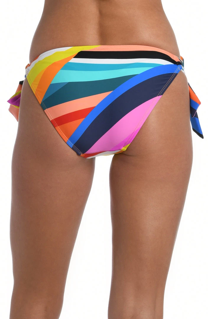 The bands of bold color on these sleek and sophisticated bikini bottoms will instantly put you in a sunshine state of mind. Adjustable side tie loops with a ring detail reveal just a hint of skin and the mid-rise cut flatters the hips. Ample rear coverage allows you to move around freely and comfortably, without having to worry about exposing more than you want to.