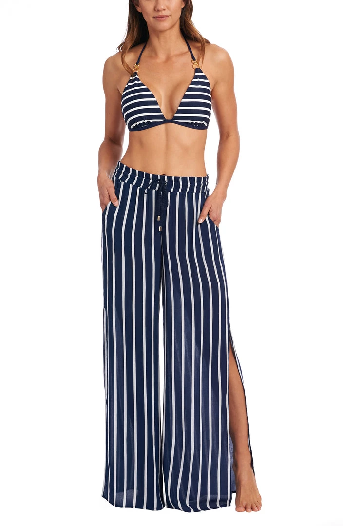 So chic, so easy. These wide leg pants by La Blanca are the perfect update to your go-to swimsuit cover-up. Breezy and billowy, they’re designed to float from poolside to tableside for drinks. Classic navy and white capri vertical stripes elongate your legs and reveal a hint of skin, with subtle side slits. A stretchy, shirred drawstring waistband comfortably fits to your body. And bonus? These bottoms have front pockets to hold important little things. Layer them on.