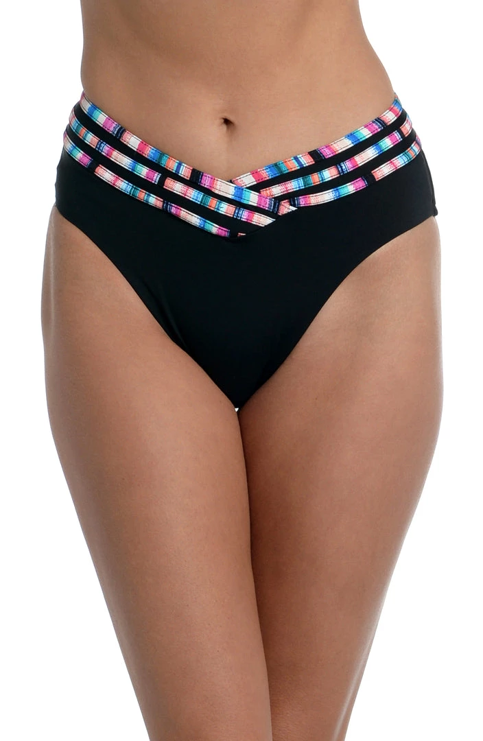 Beautiful bands of brilliant color pop against a black background on these sleek and sophisticated swim bottoms. The iconic high-waist design with crisscrossing bands that create a subtle V has a glamorous retro-inspired vibe that lets you flaunt your curves with confidence. The high waist slims the midsection (while lengthening the legs) with moderate coverage in back to ensure things stay in place.