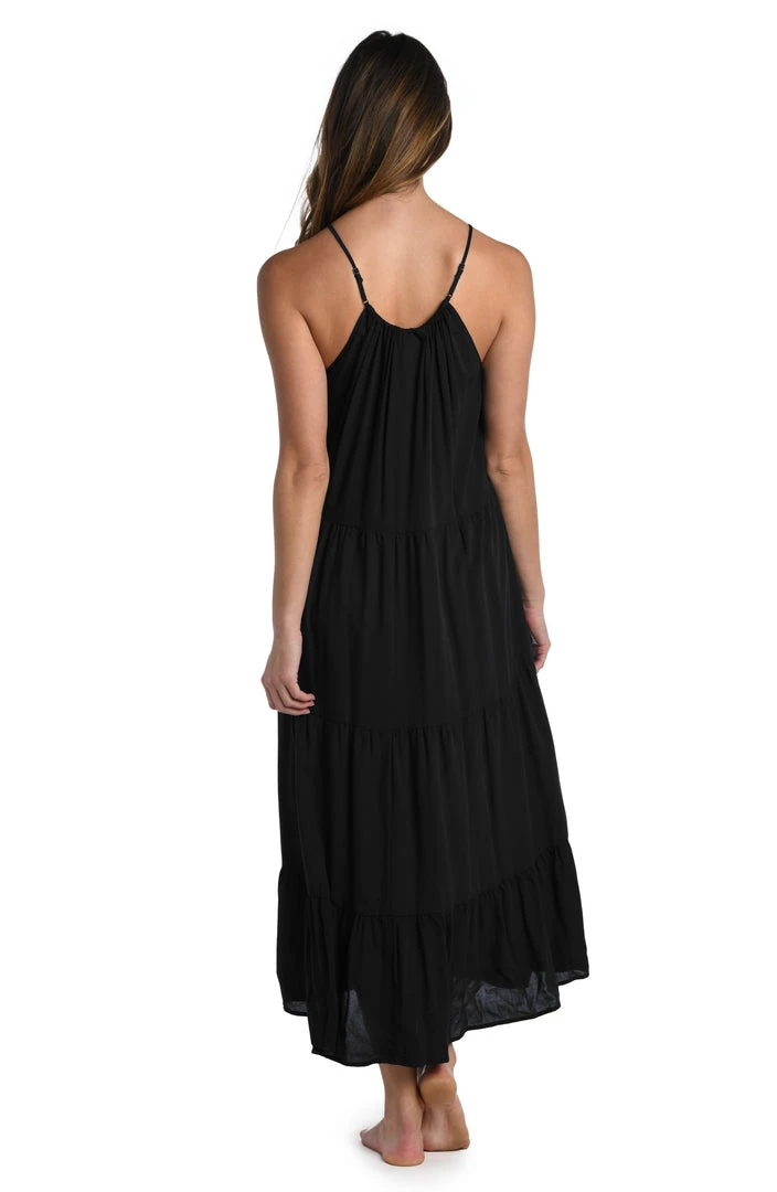 This midi dress gets its boho-inspired style from a crocheted neckline. Styled with a high neck, it cuts a striking silhouette, showing off those shoulders and toned arms. The tiered skirt has a beautiful, flowy drape.