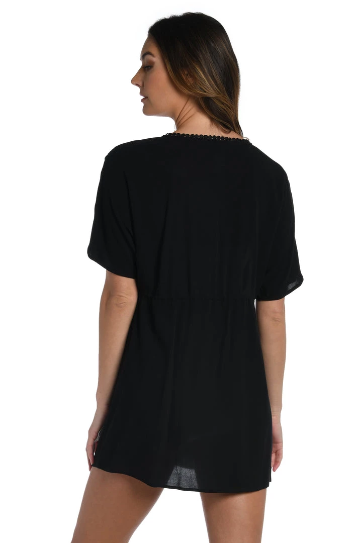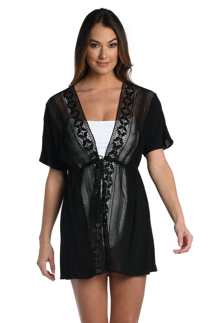 This kimono gets it’s boho-inspired style from crocheted detailing that lines the front. It’s styled with dolman sleeves and a tunnel-tie front that cinches at the waist. Throw it over your suit for a chic cover-up or layer with a cami and a pair of pants for a fashionable finishing touch.