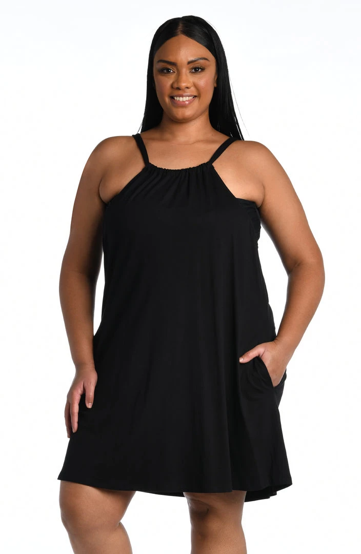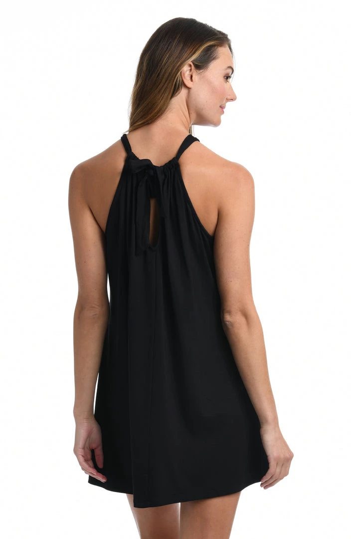 Offering an updated take on the little black dress, our high-neck version is destined to become your new favorite travel companion. Hitting just above the knees and styled with pockets, the over the shoulder neckline ties in back for an adjustable fit. Completely versatile, you can throw it on over your suit as a classy cover-up or pair with heels and statement-making jewelry for a night out on the town.