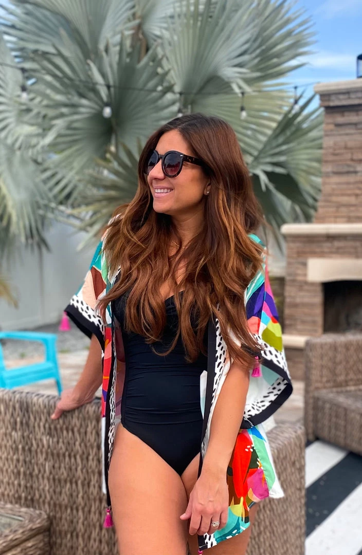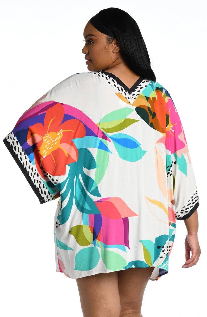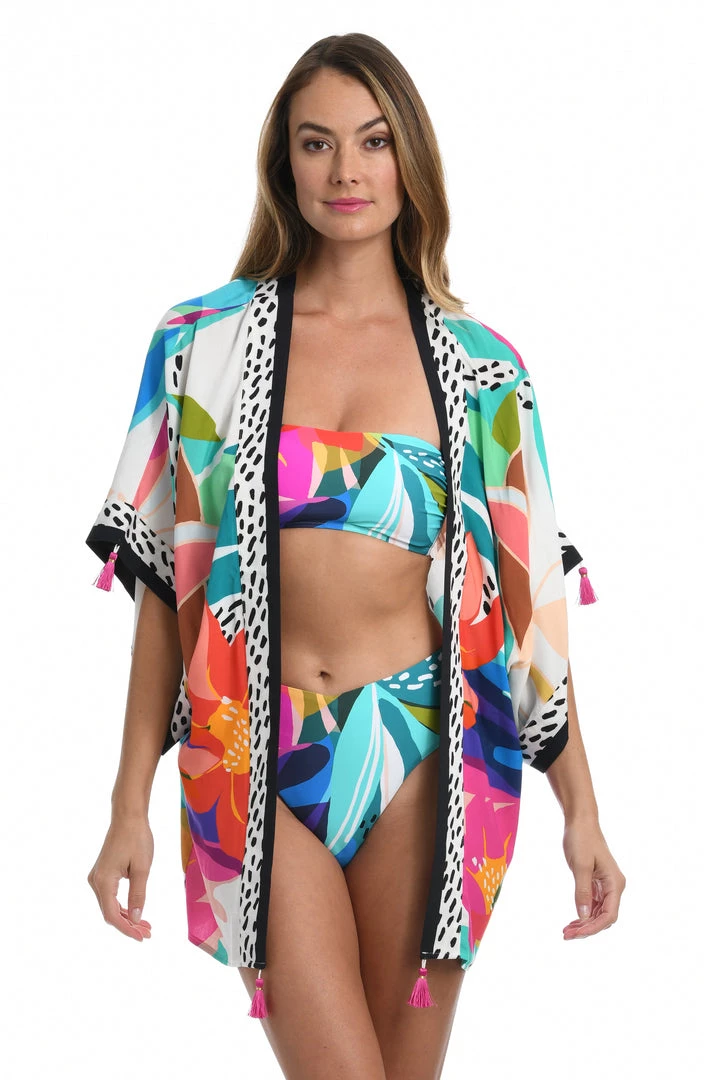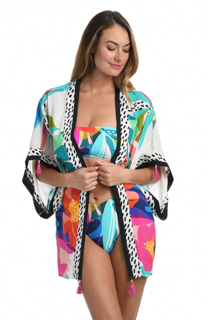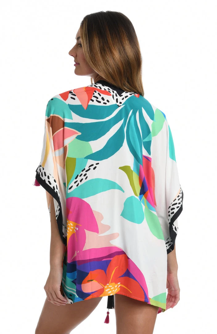 Bursting with color, this vibrant tropical print kimono will put you in a vacation state of mind. It has a breezy, square cut design and a casual open front trimmed with an animal print. Tassels at the sleeves and at the hem add a playful finishing touch. While it’s the perfect cover-up to pair with your suit, this kimono also makes a stylish statement when layered with a casual outfit.
