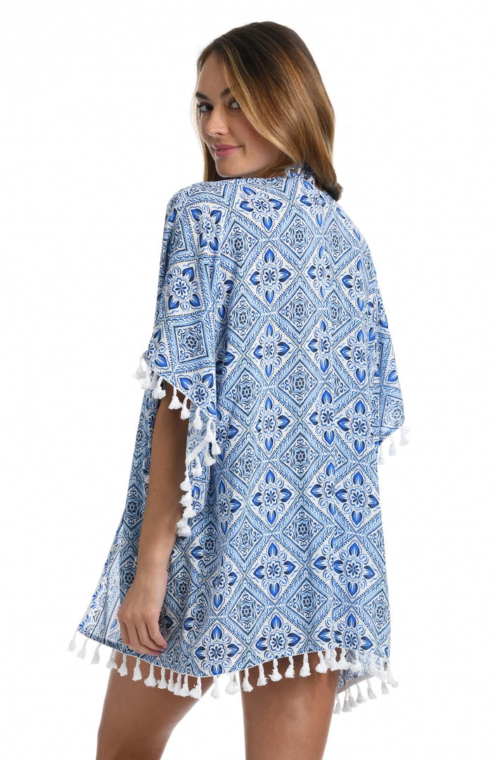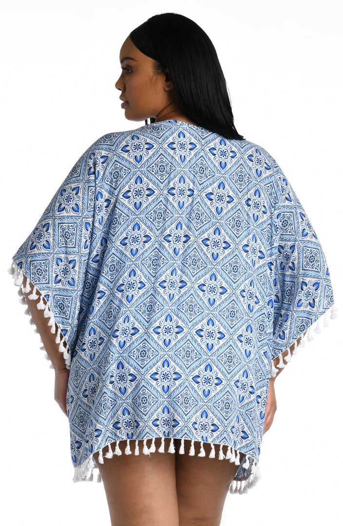 The artful mosaic on this kimono takes its cue from the azure blue waters of the Mediterranean. It has a breezy, square cut design and a casual open front for throw-on-and- go ease. Tassels at the sleeves and at the hem add a playful finishing touch. Pair with your suit or layer over a casual ensemble for statement-making style.