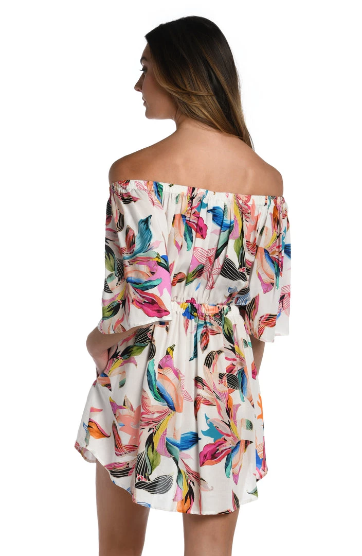 It’s just another day in paradise when you slip on this off-the-shoulder dress in a dreamy tropical-inspired print. Offering just the right amount of coverage, this resort-ready cover-up is styled with breezy bell sleeves and a drawstring waist that defines your midsection.
