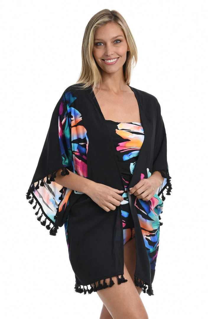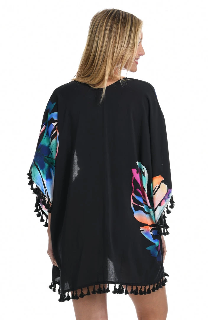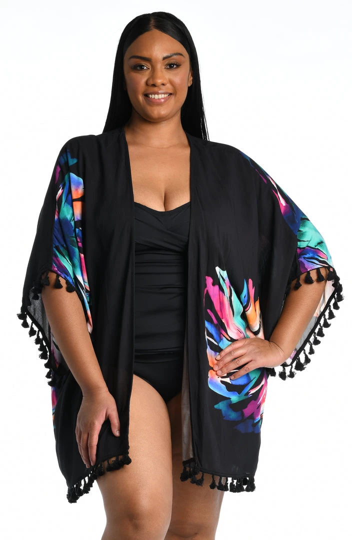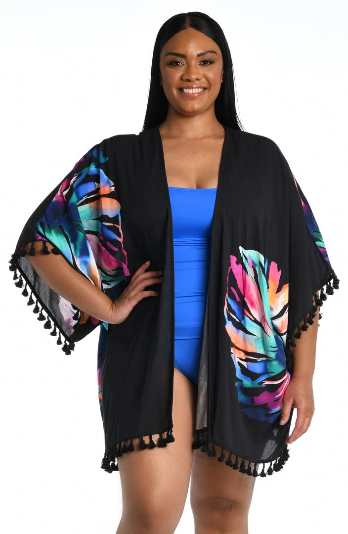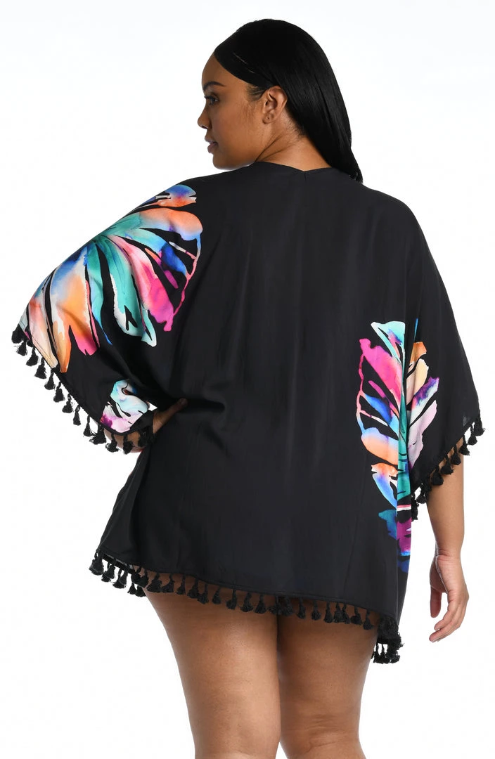 A black canvas provides the perfect backdrop for the kaleidoscope of color in brilliant hues that creates the dreamy palm fronds on our kimono. It has a breezy, square cut design and an open front that makes it simple to toss on post dip. Tassels adorn the sleeves and hem for a playful finishing touch.