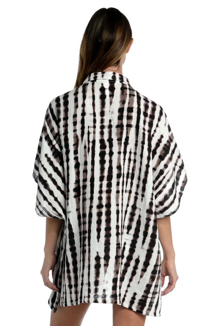 This shirtdress proves that opposites really do attract with a high-contrast stylized bamboo pattern inspired by the ikat prints that hail from Indonesia. The coolest cover-up around, it’s made from breezy, lightweight fabric that offers glimpses of your swimsuit to show through and can be worn two ways: all buttoned up and left long or unbuttoned and tied in front. Throw it on after a day at the beach or post dip for effortless coverage.