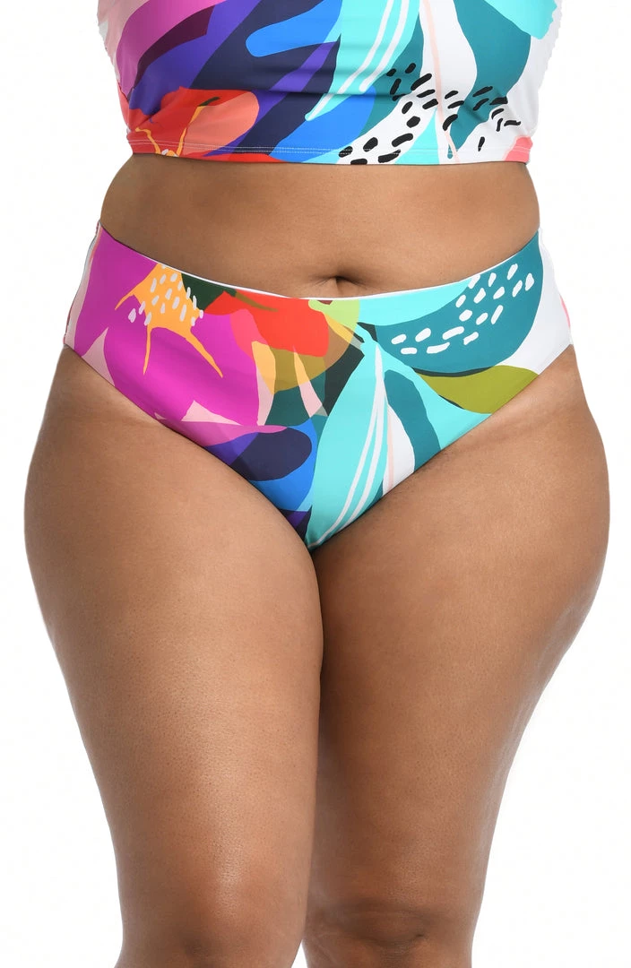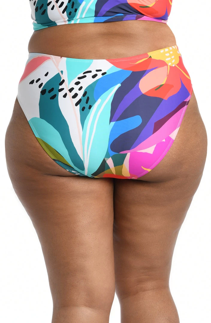 Bursting with color, these vibrant tropical print swim bottoms will put you in a vacation state of mind. Exuding a retro-inspired glamorous style, the classic hipster cut gives you a little extra coverage while still staying sexy. Moderate coverage in back gives you all the confidence you need to take on the day, whether swimming, snorkeling or paddleboarding.