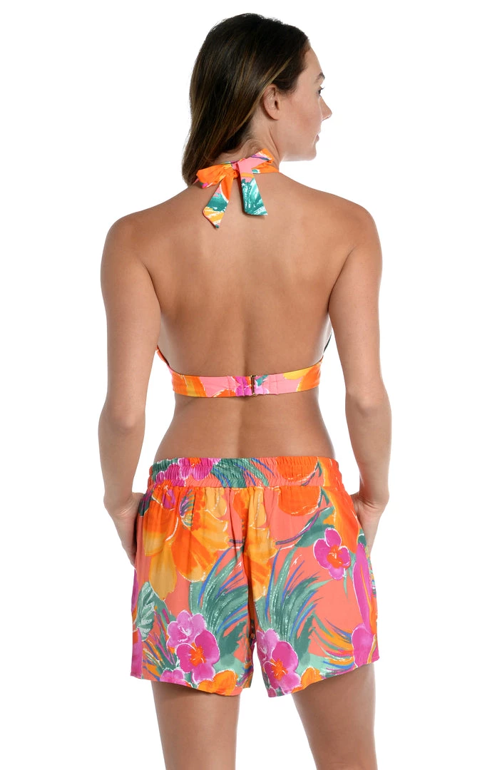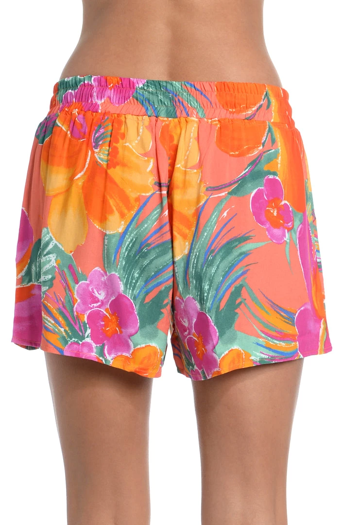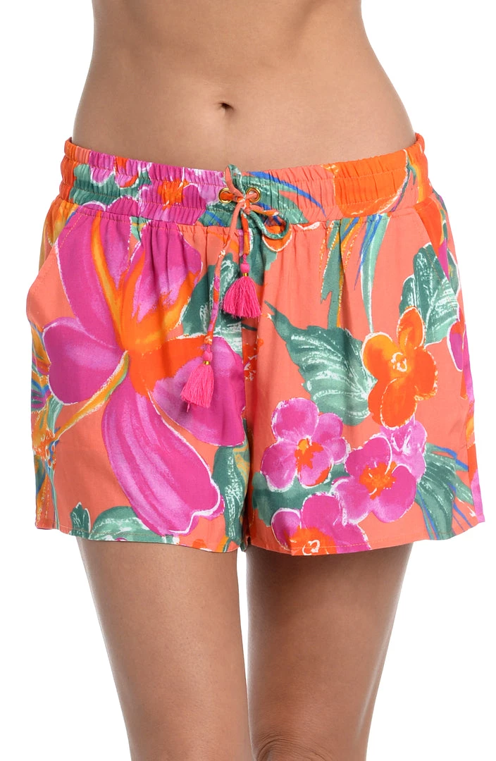 Too hot to handle, the bold tropical print on these beach shorts matches your vibrant personality. The elasticized waist with a drawstring offers a comfortable, adjustable fit, while pockets provide the perfect place to tuck in a room key or lip balm.