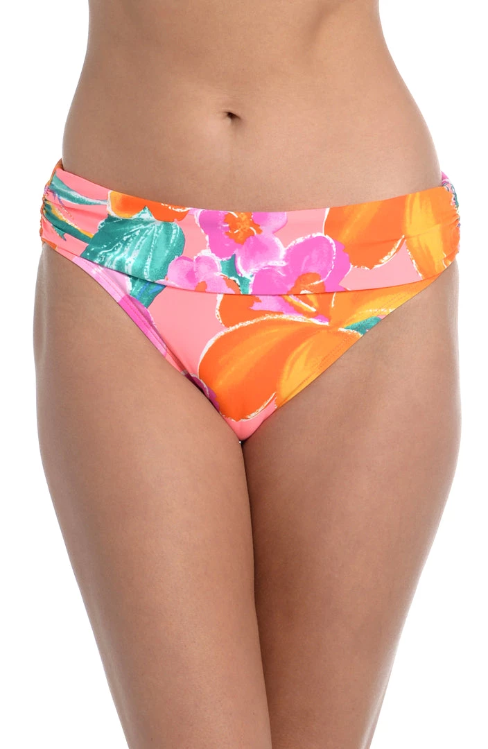 Too hot to handle, the bold tropical print on these swim bottoms matches your vibrant personality. These hipsters cut a sexy silhouette with a mid-rise fit that flatters your figure. A ruched band instantly smooths and slims your tummy for a trim, toned look. Moderate coverage in back keeps the look sophisticated while still showing off your curves.