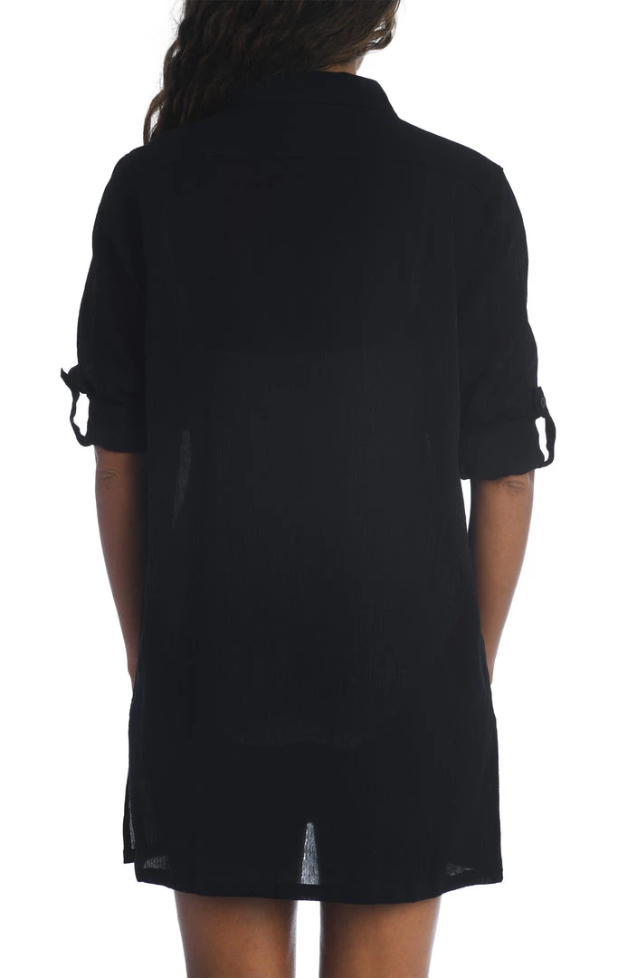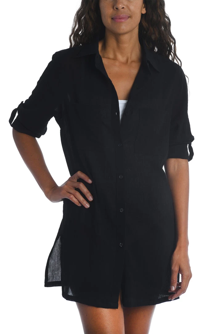 Dance off your worries poolside in this swimwear cover-up camp shirt by La Blanca. This item radiates style. The shirt sleeved cut and slits at the hem give this a cool feel, for a warm summer night.