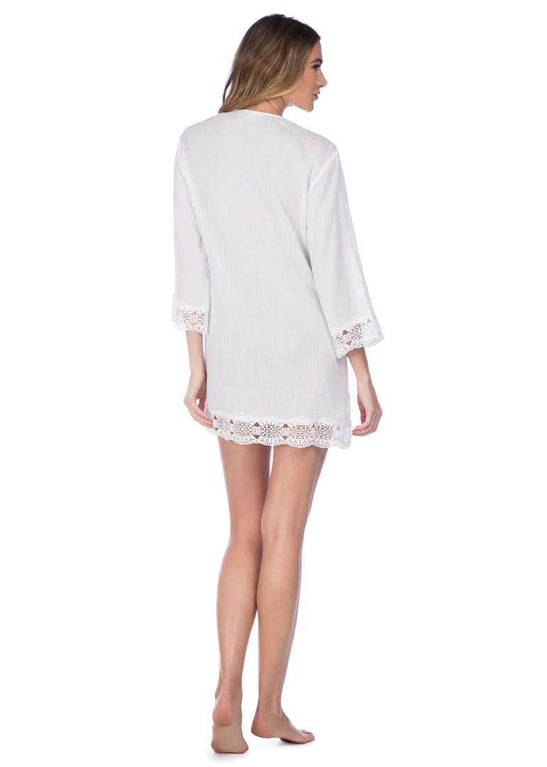 Sweetly sophisticated, this solid tunic offers just the right amount of coverage with a crocheted center panel in front to offer a glimpse of your swimsuit underneath. Crocheted trim around the neck, cuffs and hem gives this post-dip cover-up an effortless elegance that takes you from beach to brunch in style.