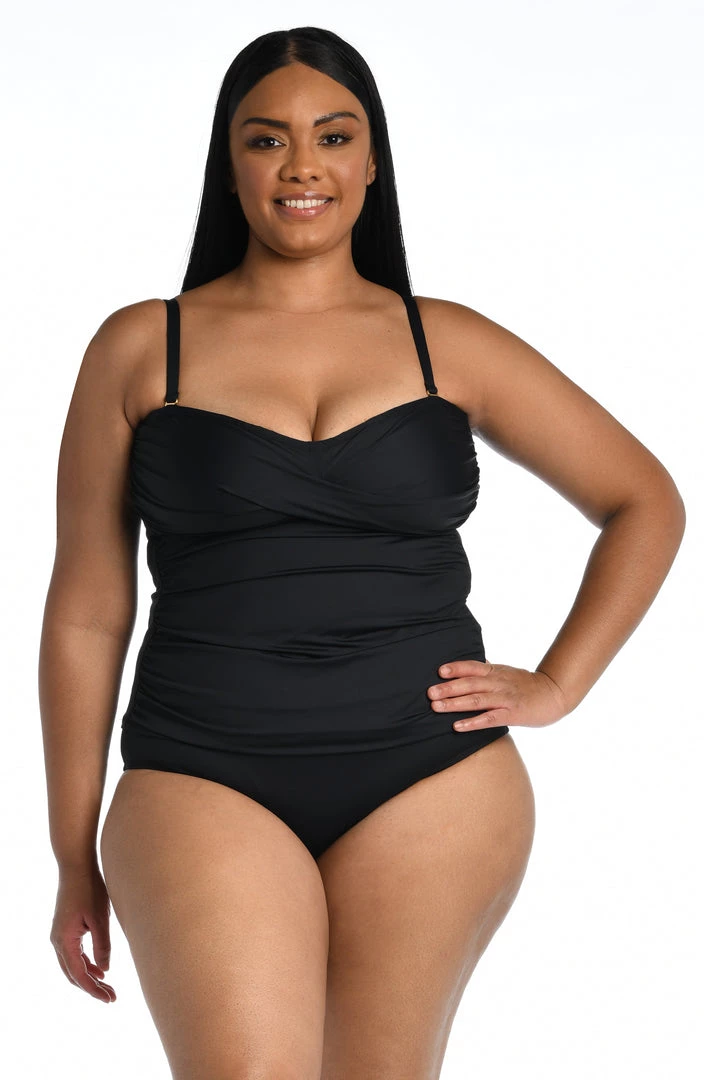 Offering up plenty of glamour-girl style, our bandini features a twist front that creates a bust-enhancing sweetheart neckline. Allover shirring offers up a slimming fit, instantly erasing worry spots like magic. Remove the straps (and say goodbye to tan lines) to transform it into a bandeau.