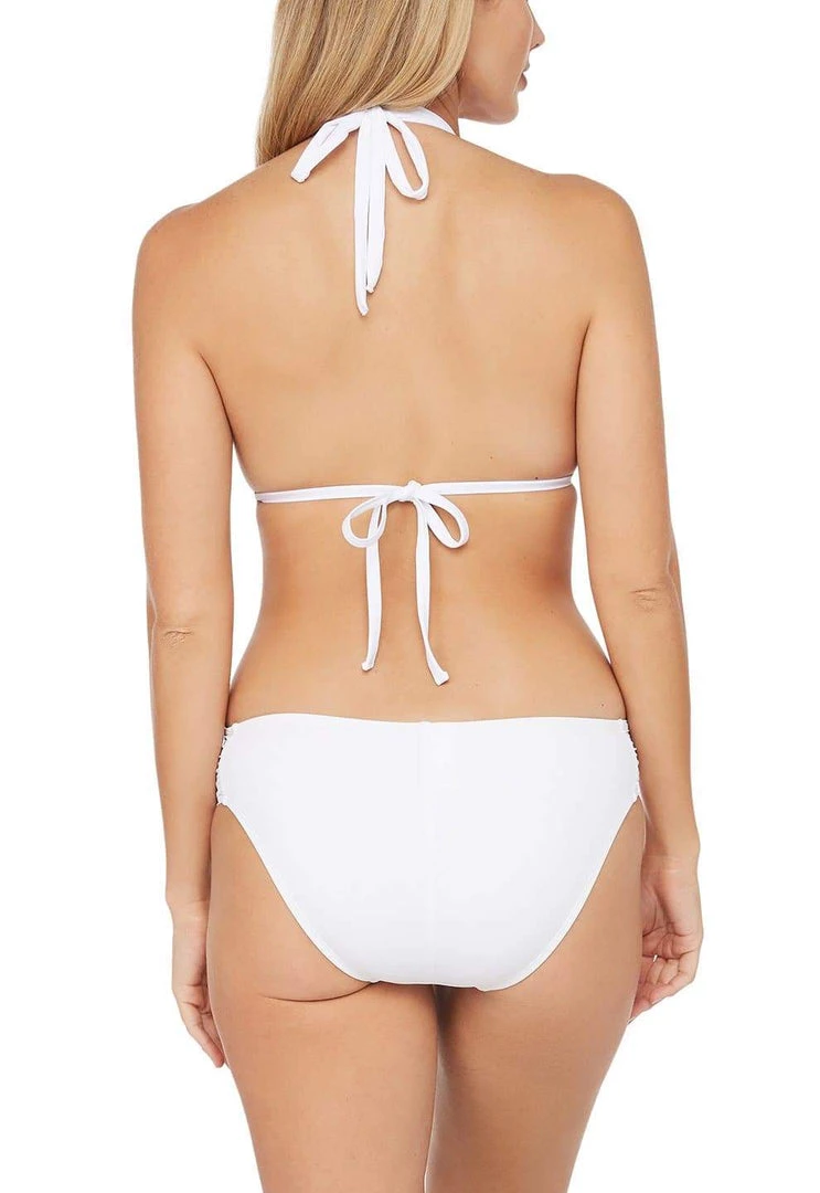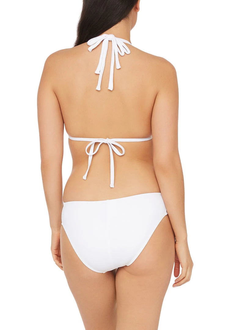Have a blast on the pool deck in this halter triangle top by La Blanca. The wispy cut and deep v-neckline is playful, while the adjustable bust coverage tailors to your coverage needs. Self-tie closures at the neck and back allow for full customization.