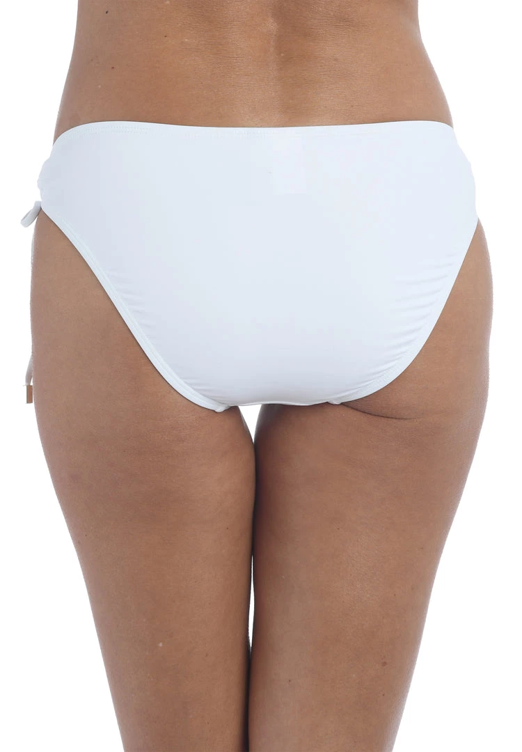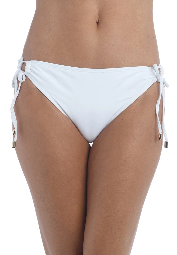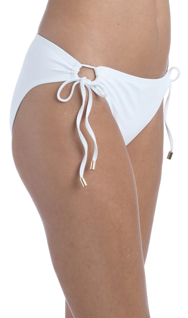 These bikini bottoms leave a little something to the imagination with adjustable side tie loops fitted with metal tips that reveal just a hint of skin. The hipster cut flatters the hips with just enough coverage in back so you won’t have to worry about these bottoms riding up.