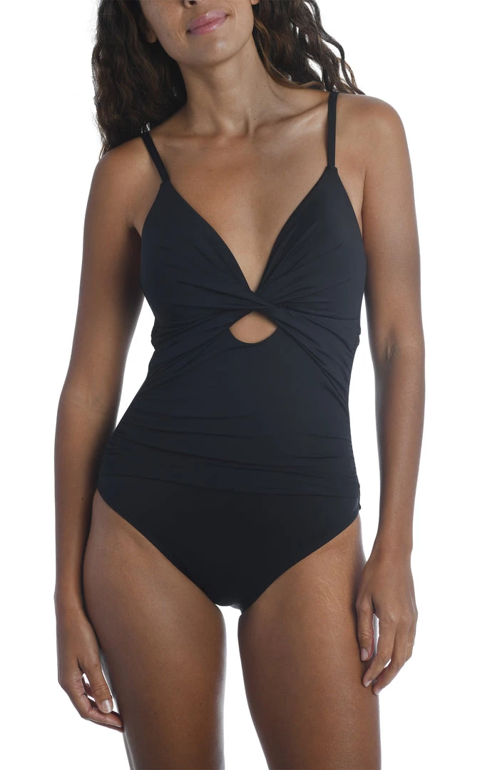 Dazzle the crowd in this twist keyhole one-piece swimsuit by La Blanca. A keyhole v-neck enhances your feminine features, and comes together with a twist front design. Adjustable straps and molded cups tailor to your individual form. Built in tummy control adds a sleek, polished look and feel. Moderate rear coverage.