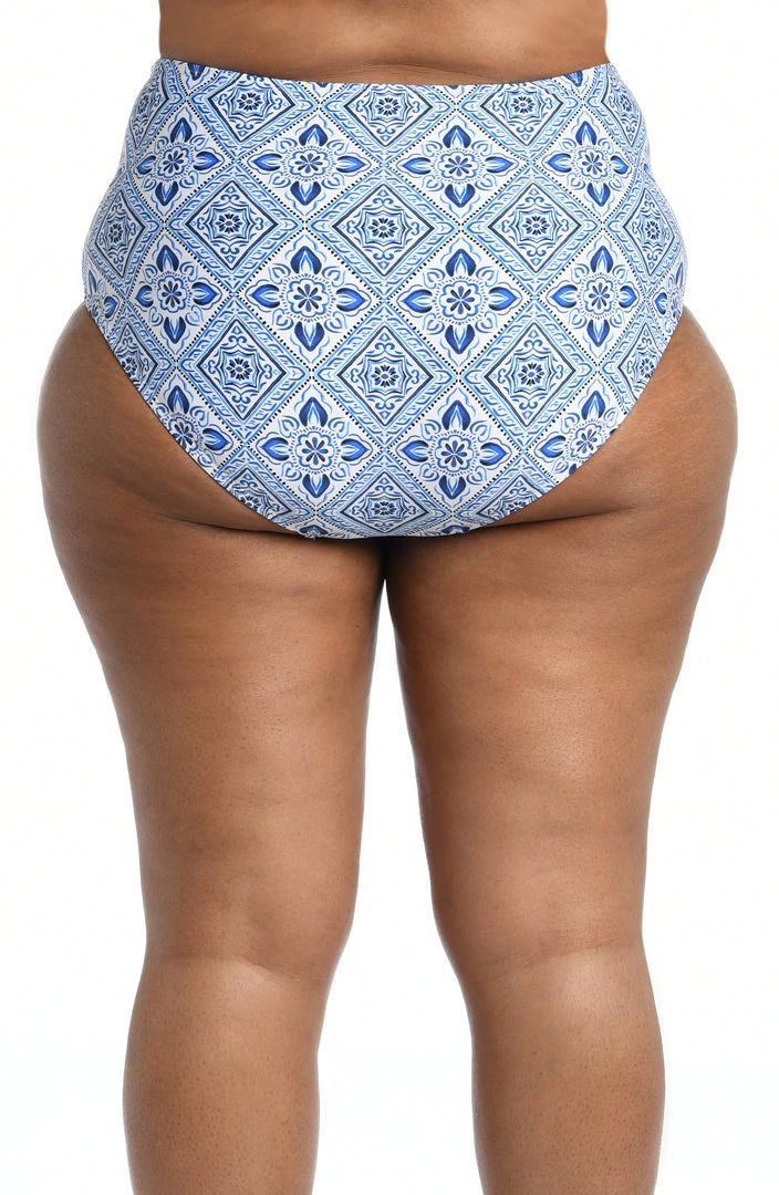 The artful mosaic on these swim bottoms takes its cue from the azure blue waters of the Mediterranean. The iconic high-waist design has a glamourous retro-inspired vibe that lets you show off your curves with confidence. The high waist trims the midsection while lengthening the legs and moderate coverage in back ensures these bottoms stay firmly in place.