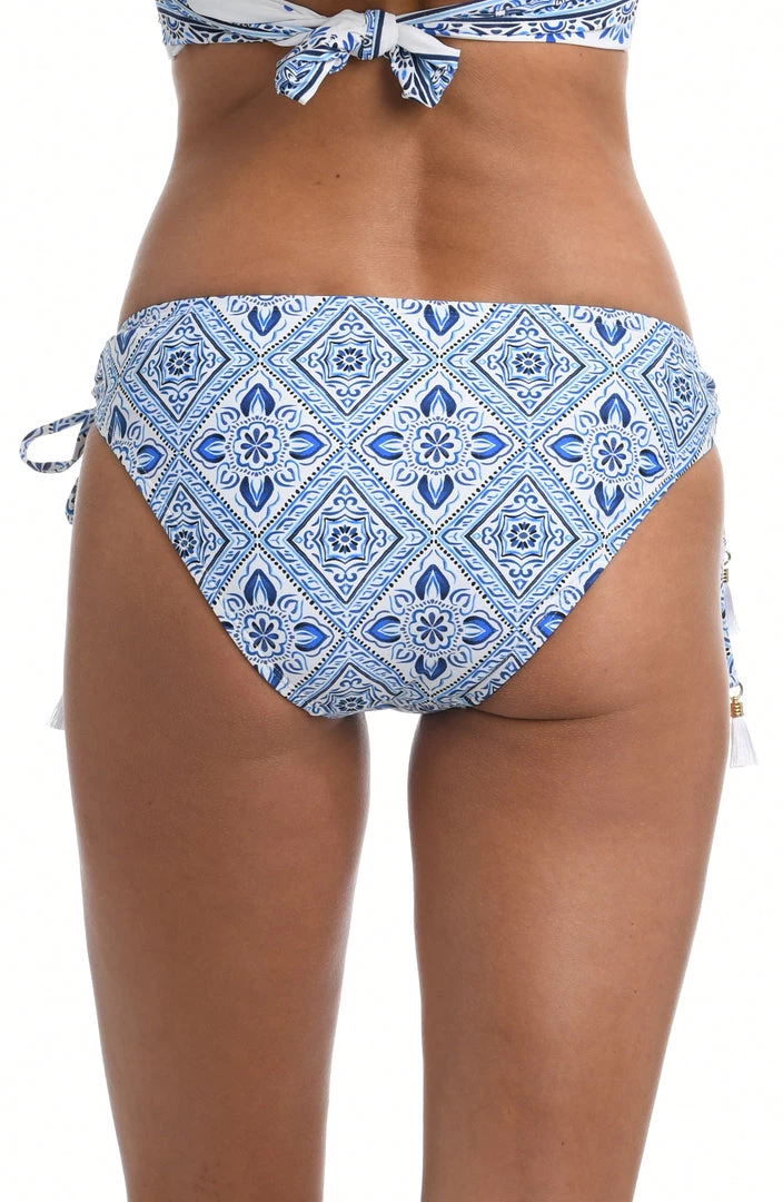 The artful mosaic on these hipster bikini bottoms takes its cue from the azure blue waters of the Mediterranean. Adjustable side tie loops tipped with tassels show off just enough skin to keep the look classy. The hipster cut flatters the hips with enough coverage in back, so you won’t have to worry about things getting too cheeky.