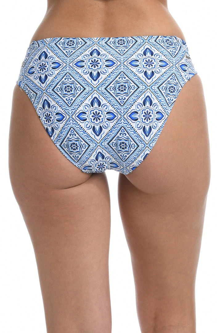 The artful mosaic on these hipster bikini bottoms takes its cue from the azure blue waters of the Mediterranean. The hipster cut with crisscross side bands flatters the figure, while moderate coverage in back allows you to move around confidently, no matter what the day (or evening) brings.