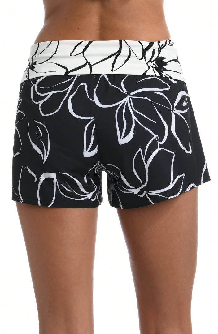 With a striking black-and-white stylized floral print, our board shorts prove that opposites really do attract. Beautifully balanced, they allow you to move freely without being overly baggy, offering a little extra coverage when you need it. The fold-over waistband offers a comfortable, slimming fit and a 3″ inseam is just the right length to show off those legs.