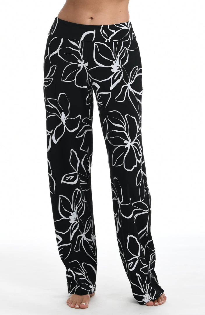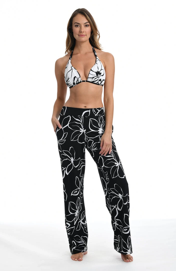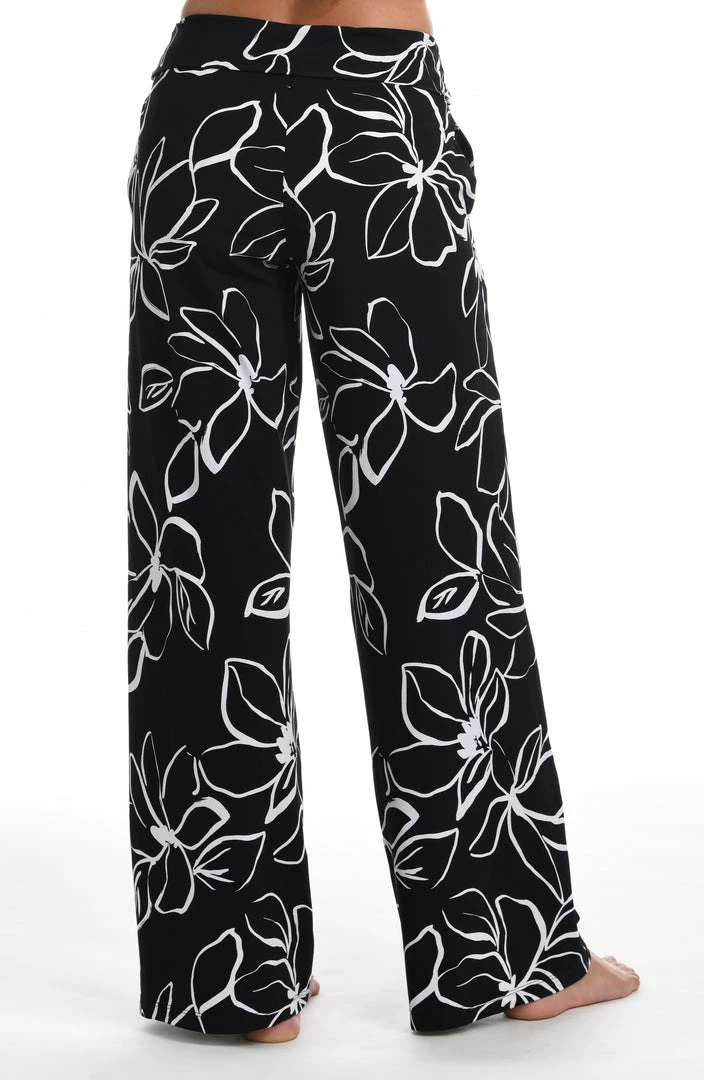 With a striking black-and-white stylized floral print, our palazzo beach pants prove that opposites really do attract. Beautifully balanced, these billowy wide-leg pants are perfect for slipping on after a dip to return to your cabin or breeze into town. They’re styled with a comfortable elasticized waistband, front pockets and side slits for easy movement.
