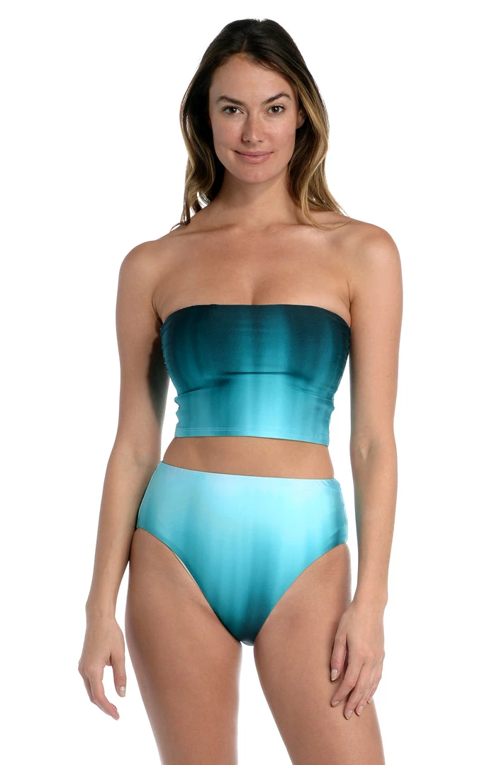 Inspired by the depth of color in the deep blue sea, gorgeous shades of turquoise take on an ombre effect in this midkini. Offering the perfect balance between a bikini and tankini, this suit has sweetheart silhouette that flatters your bustline. Remove the neck strap to convert it into a bandeau. Built-in cups and an adjustable tie back keep you comfortably lifted.