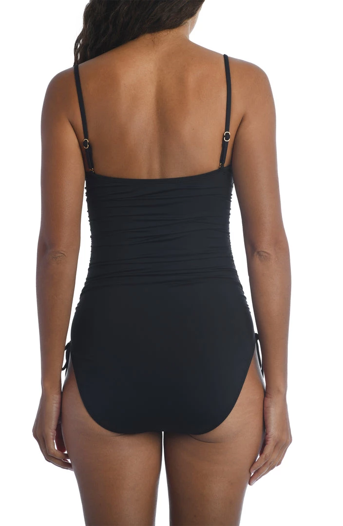 Channel your inner goddess in this bandeau one-piece swimsuit by La Blanca. The sweetheart neckline finishes the cut in a retro style. Removable, adjustable straps and molded cups allow for the bare bandeau look, while slimming fabric rouching add a smooth and flawless look. Moderate rear coverage.