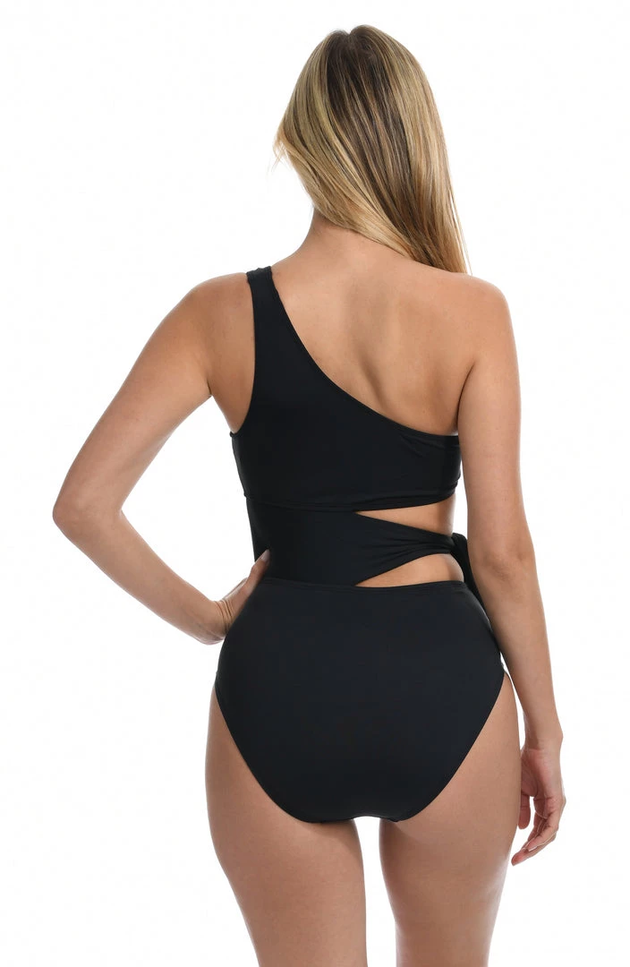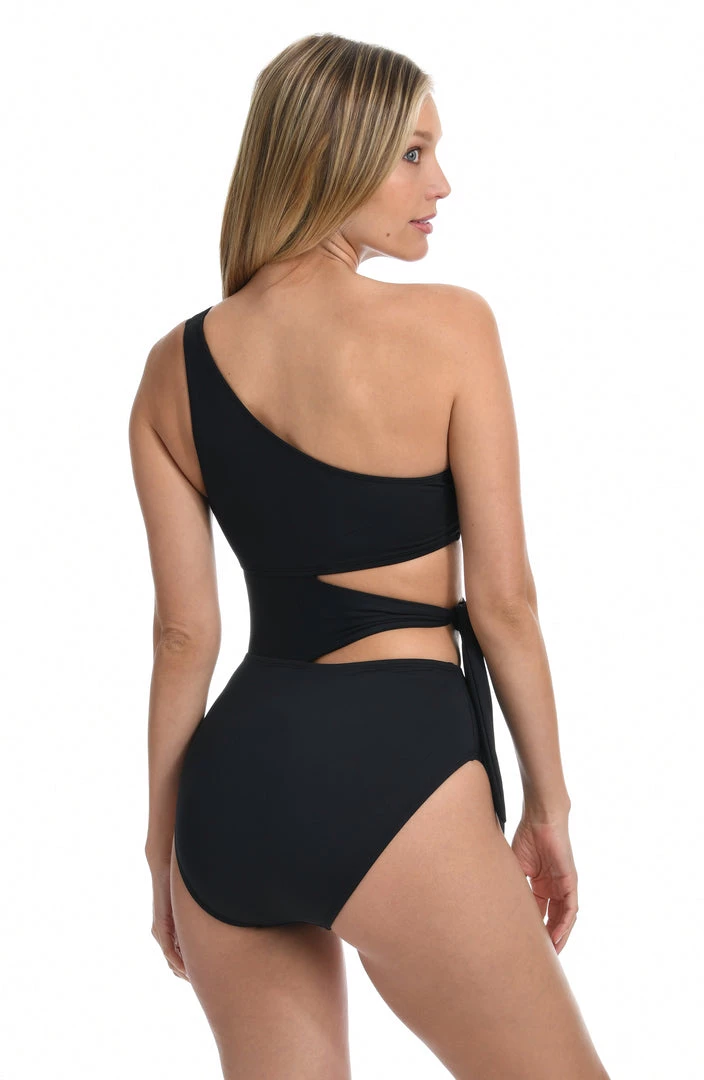 This one-piece suit gets a sexy update with a tie that wraps around the middle showing of just enough skin to be subtly seductive. The one-shoulder design brings balance to the neckline while instantly slimming the arms. Built-in tummy control and ample coverage in the rear give you the confidence you need to strut around the pool in sophisticated style.