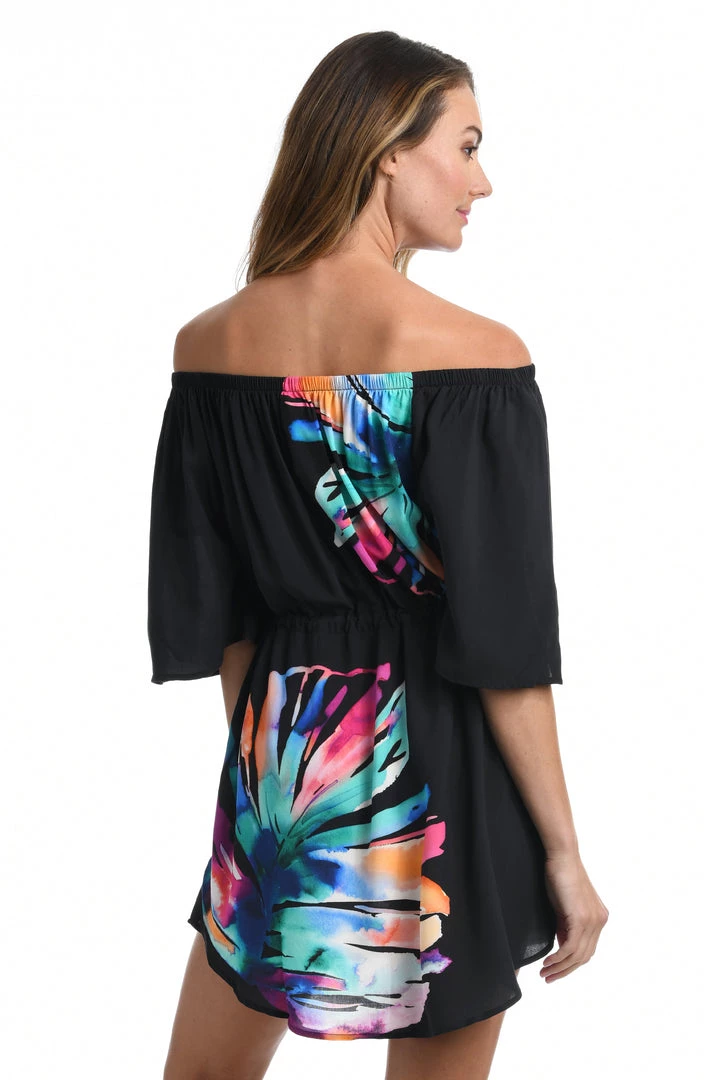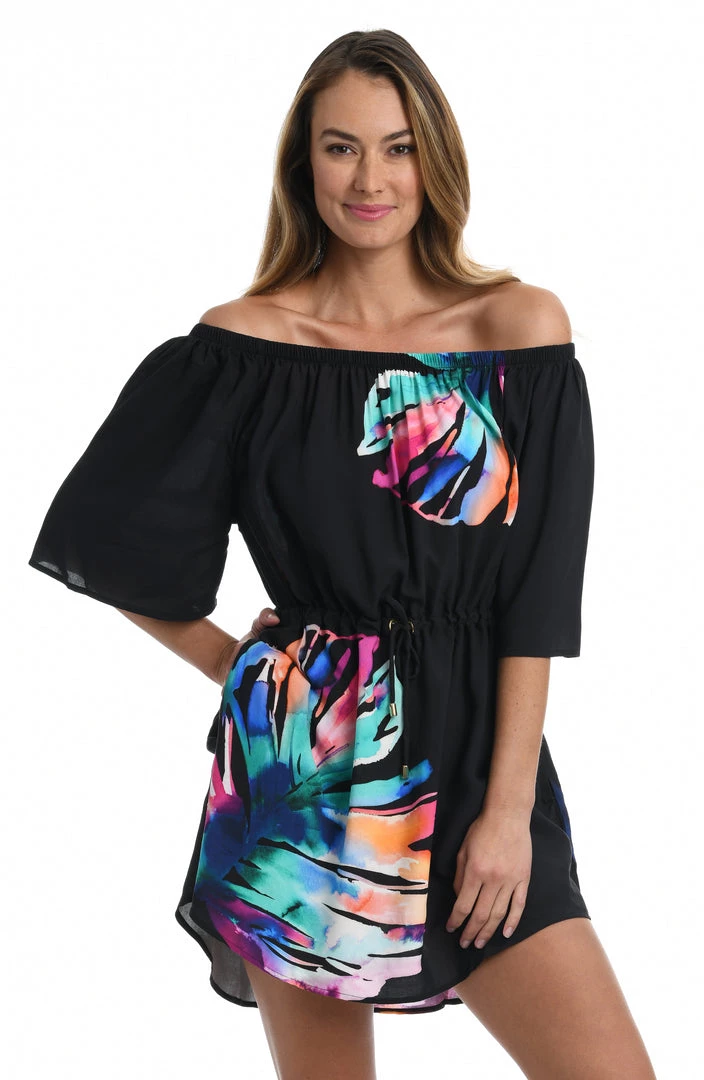 A black canvas provides the perfect backdrop for the kaleidoscope of color in brilliant hues that creates the dreamy palm fronds on our off-the-shoulder dress. Offering just the right amount of coverage, this resort-ready cover-up is styled with breezy bell sleeves and a drawstring waist that defines your waist.