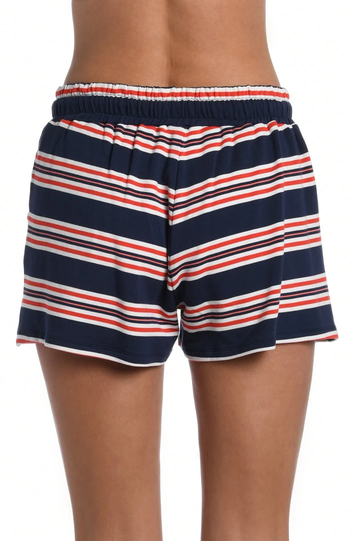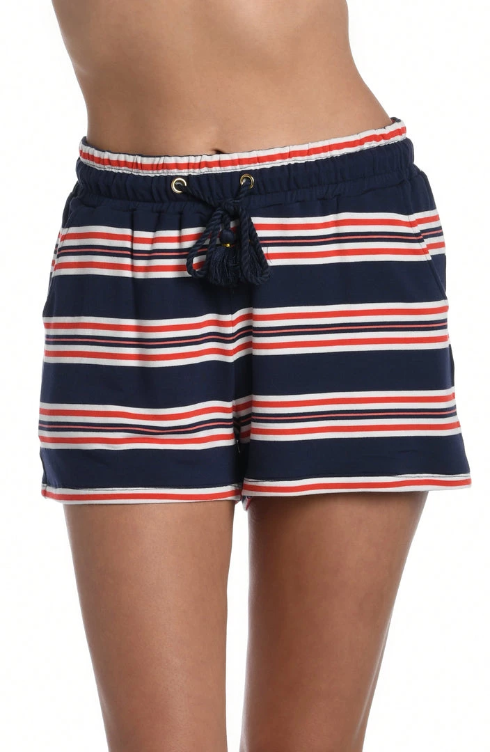 Show your stripes in patriotic style with these red, white and blue beach shorts. The elasticized waist with a drawstring tie offers a comfortable, adjustable fit, while pockets provide the perfect place to tuck in a room key or lip balm.