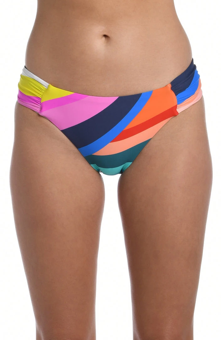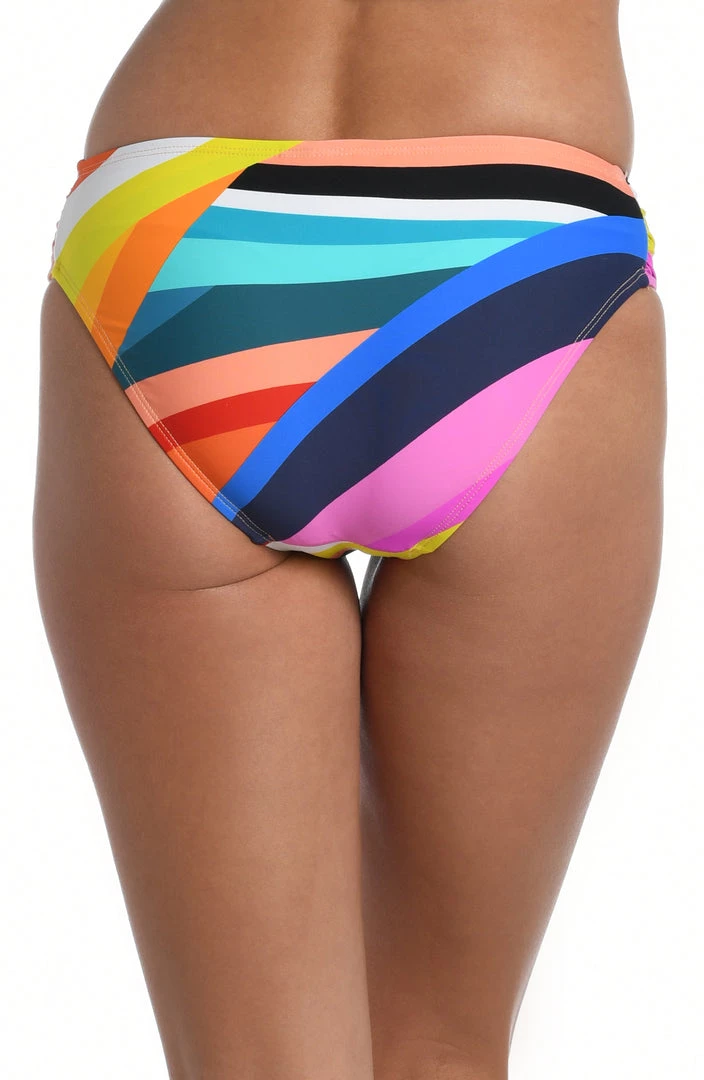 The bands of bold color on these sleek and sophisticated bikini bottoms will instantly put you in a sunshine state of mind. Shirring at the hips instantly flatters your figure, while moderate coverage in back allows you to move comfortably no matter what’s on the itinerary.