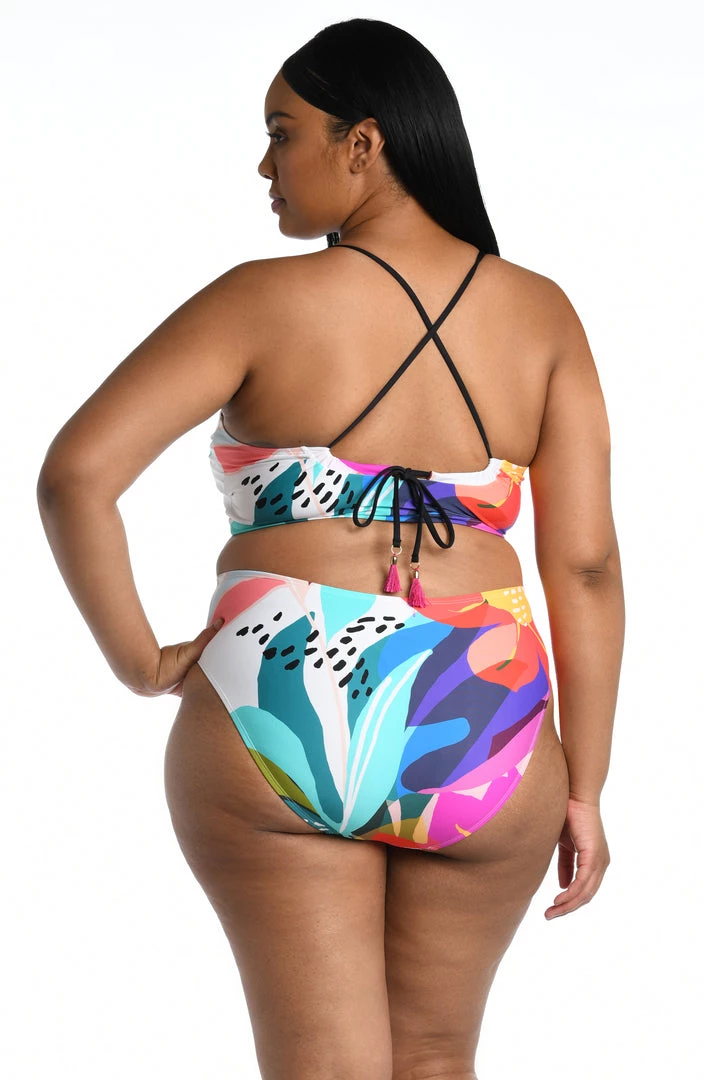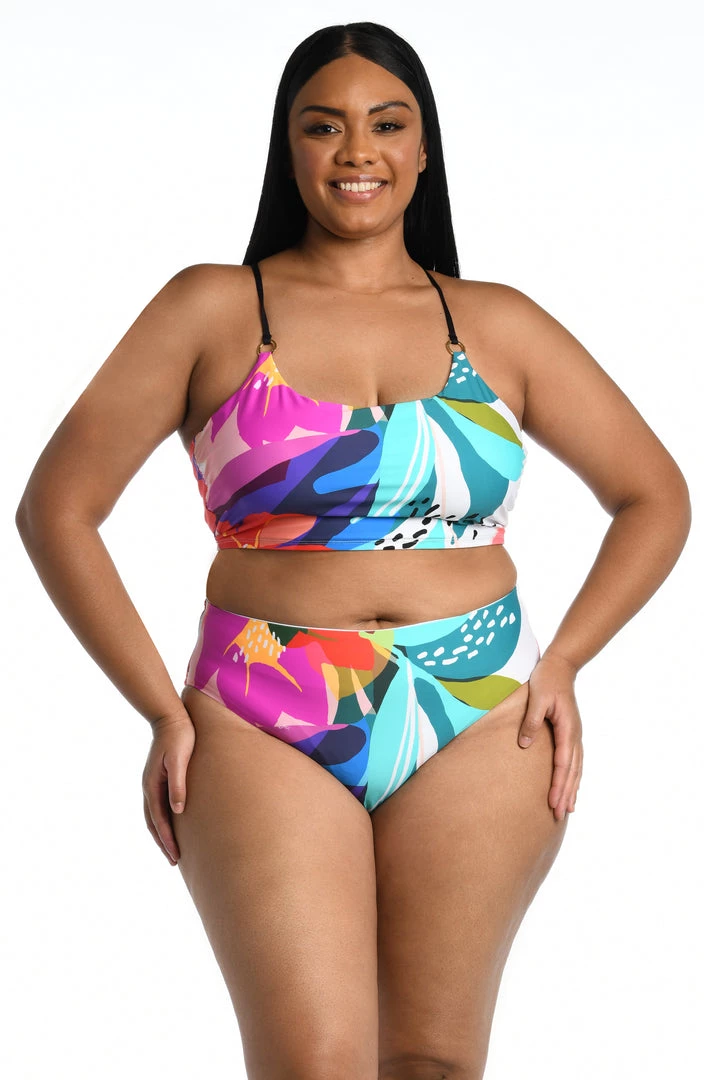 Bursting with color, this vibrant tropical print longline bikini top will put you in a vacation state of mind. Offering a little more coverage โ but still super sexy โ this top features a demi-scoop neckline. The straps are detailed with luxe gold loops and crisscross in back for an adjustable fit. Tassels add a playful finishing touch.