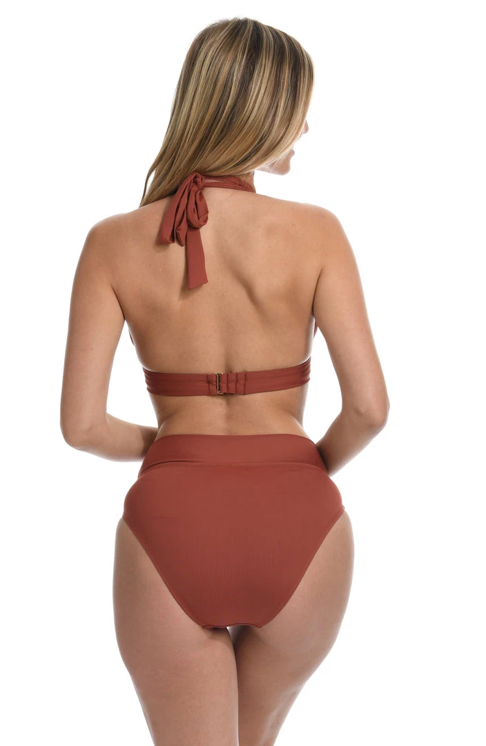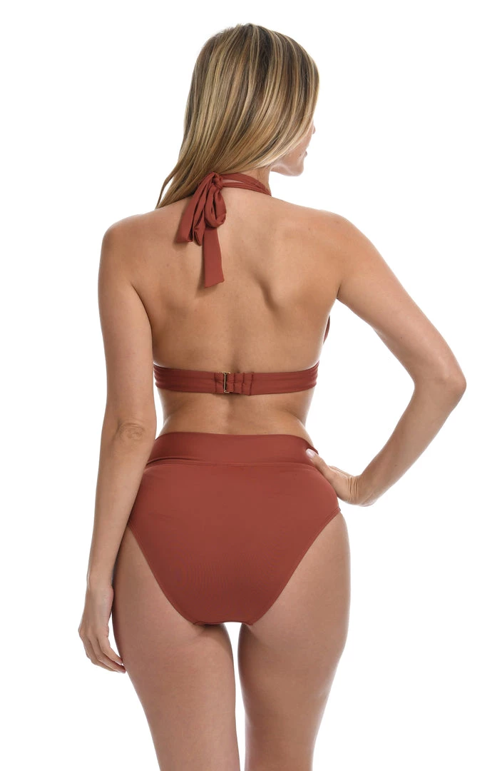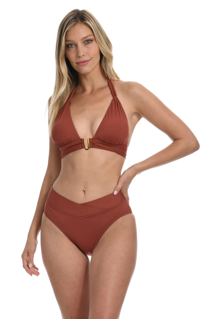 This gorgeous halter-style bikini bra top will have everyone’s head turning. The deep v-plunge neckline joined in the center with luxe gold hardware lifts and separates, while gently shirred bands under the bustline provide slimming support. The double straps tie around the neck for an adjustable fit and the back strap keeps everything firmly tucked in.