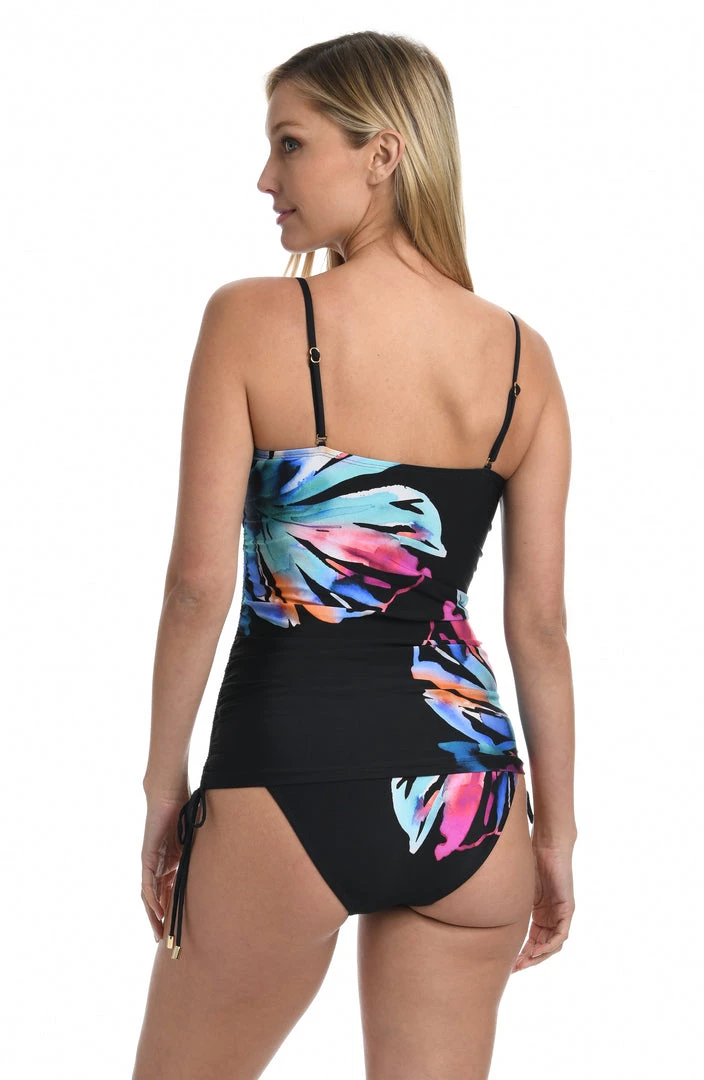 A black canvas provides the perfect backdrop for the kaleidoscope of color in brilliant hues that creates the dreamy palm fronds on our bandeaukini. Cinch the drawstrings at each side to highlight those curves, then remove the straps to create a strapless bandeau. Allover shirring instantly slims and smooths, making those worry areas disappear like magic.