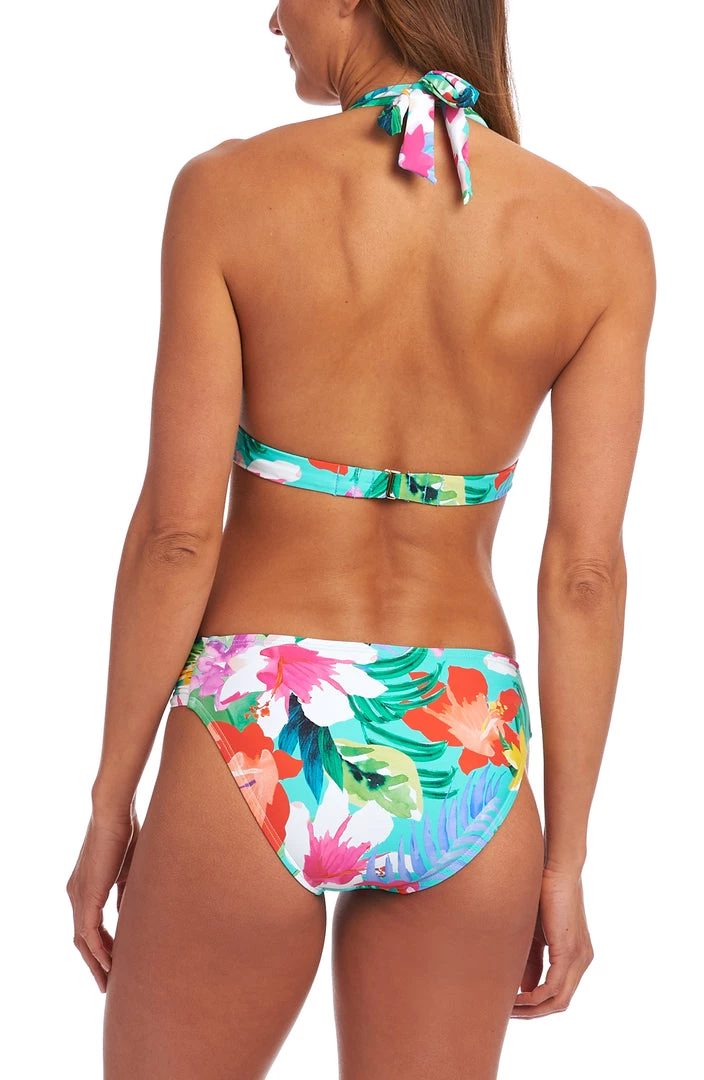 This tropical print halter bra-style bikini top is up for anything, whether snorkeling in the sea or swimming in the pool. The sexy v-plunge neckline gathers in the middle with a glamorous gold hoop for a luxe touch. The double straps tie around the neck for an adjustable fit.